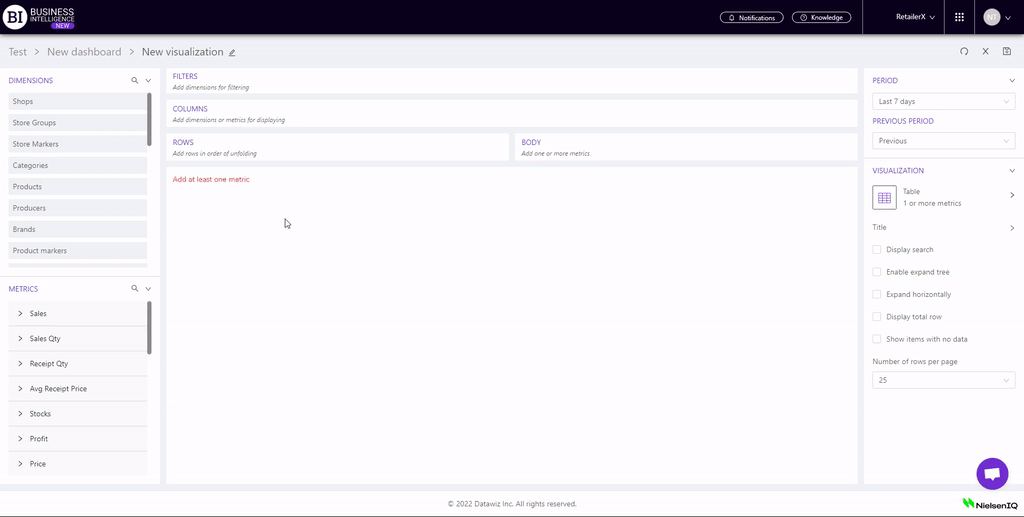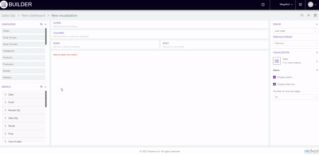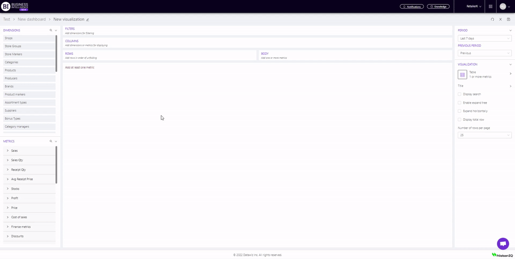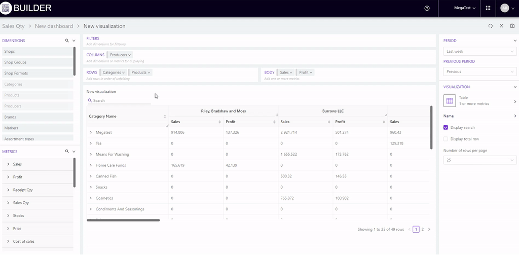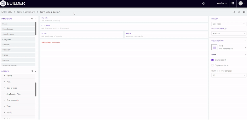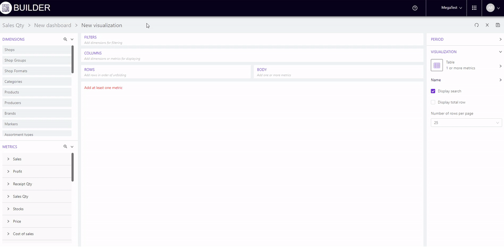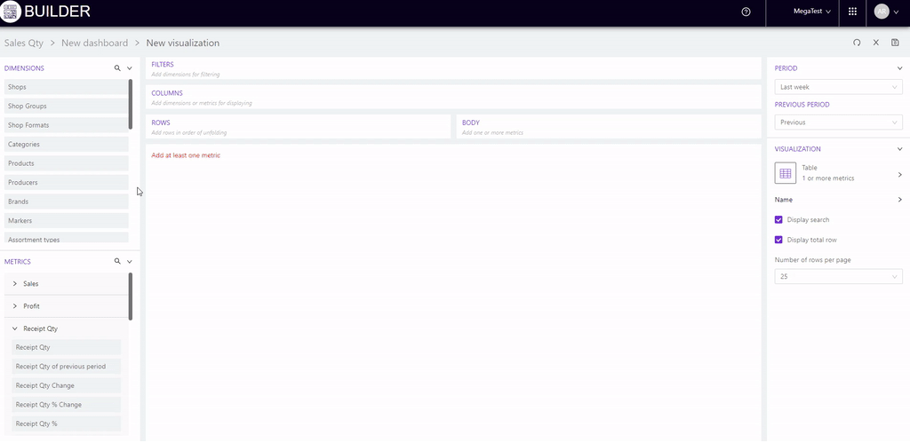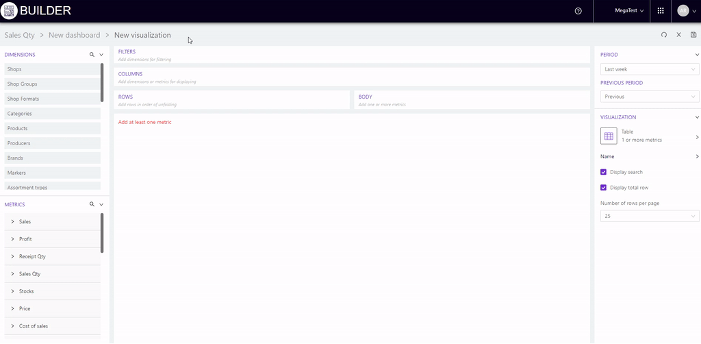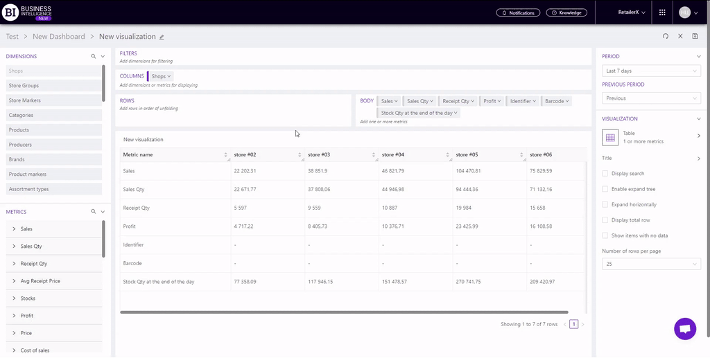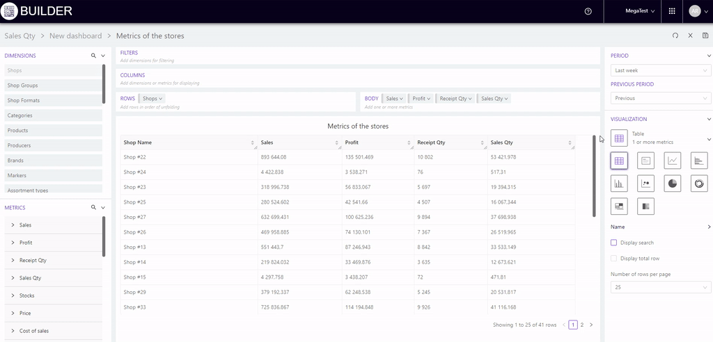 For example, we will add stores to "Columns", and metrics to "Rows": Sales, Receipts qty, Sales qty and Avg receipt price.