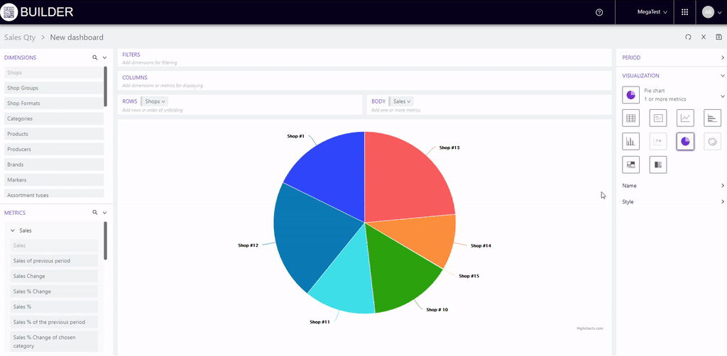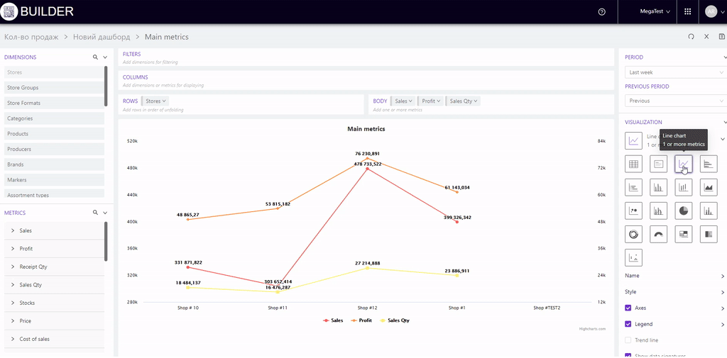 For example, we will add stores to "Columns", products to "Rows", and metrics to "Body": Sales, Profit, Sales qty.