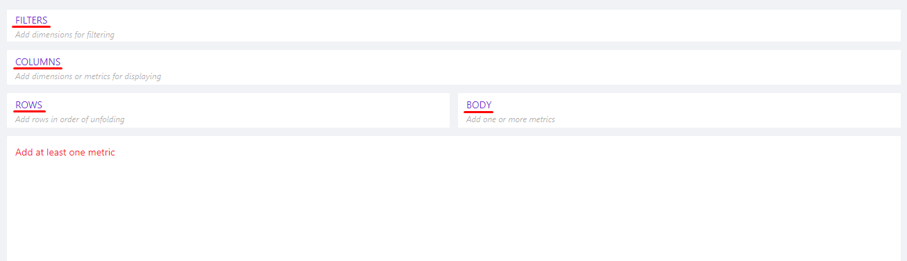 Rows - allows to add dimensions or metrics that will be shown in the rows of the table.