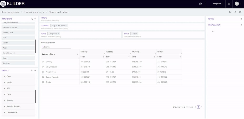 For example, we add days of the week to the "Rows", add stores to the "Columns", and drag the indicator "Sales" from metrics "Sales" to the "Body".