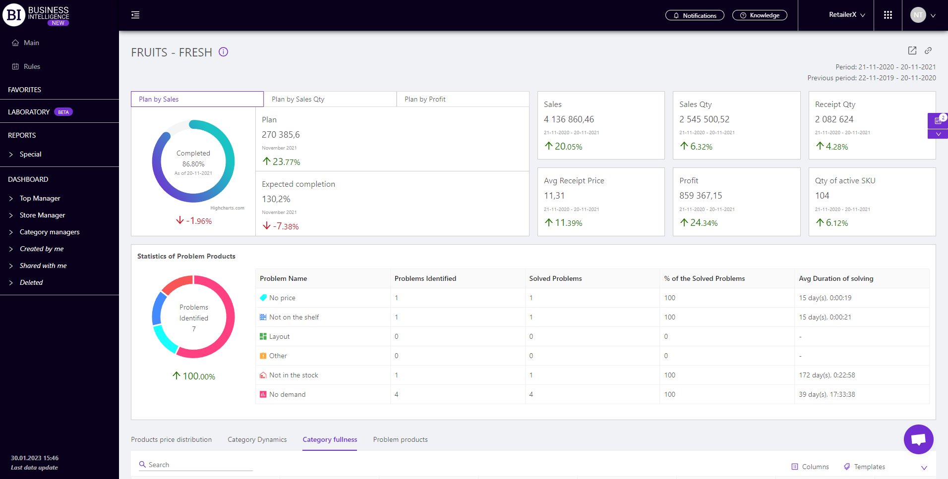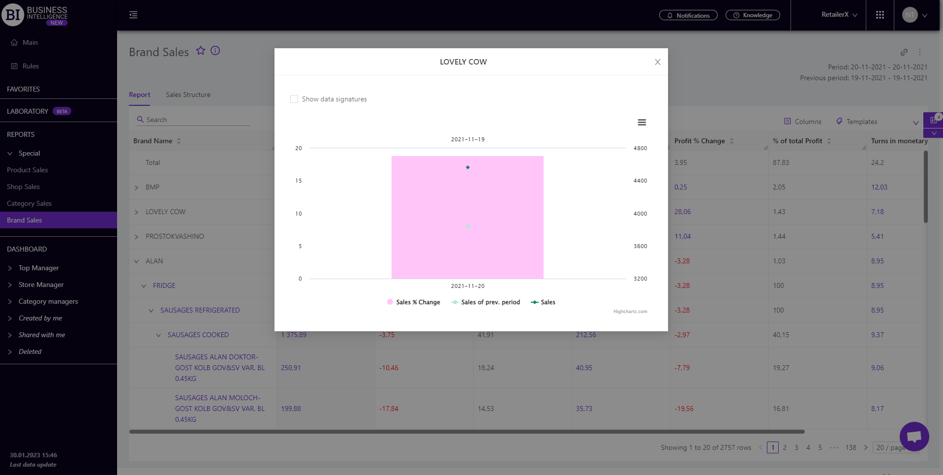 Brand salesStore cardProduct CardBasket AnalysisQuadrant analysisProducers analysisPlanogram EfficiencyLost SalesSales ChangeCategory managersSuppliers salesMarkers comparisonCategory CardProducts salesStores salesCategories salesStock MonitoringMainUnsaleable productsPrediction of OoS24-Hour AnalysisProducts movementEffectiveness of сashiersProducts for adjustmentPOS-terminal TrafficSales PlansPromotion AnalysisNew SKUEffectiveness of Loyalty ProgramPromo CardRFM - analysisStatistic of Loyalty ProgramCustomer Loyalty SegmentationLoyalty CardComparative DynamicsReceiptsBRAND SALES