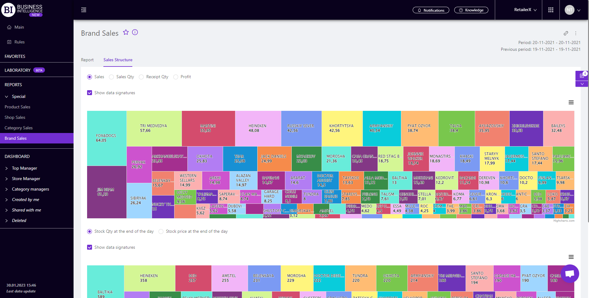 - upper visualization represents the structure of brands sales, and is based on one of the following metrics: Sales, Sales Qty, Receipts Qty, Profit.