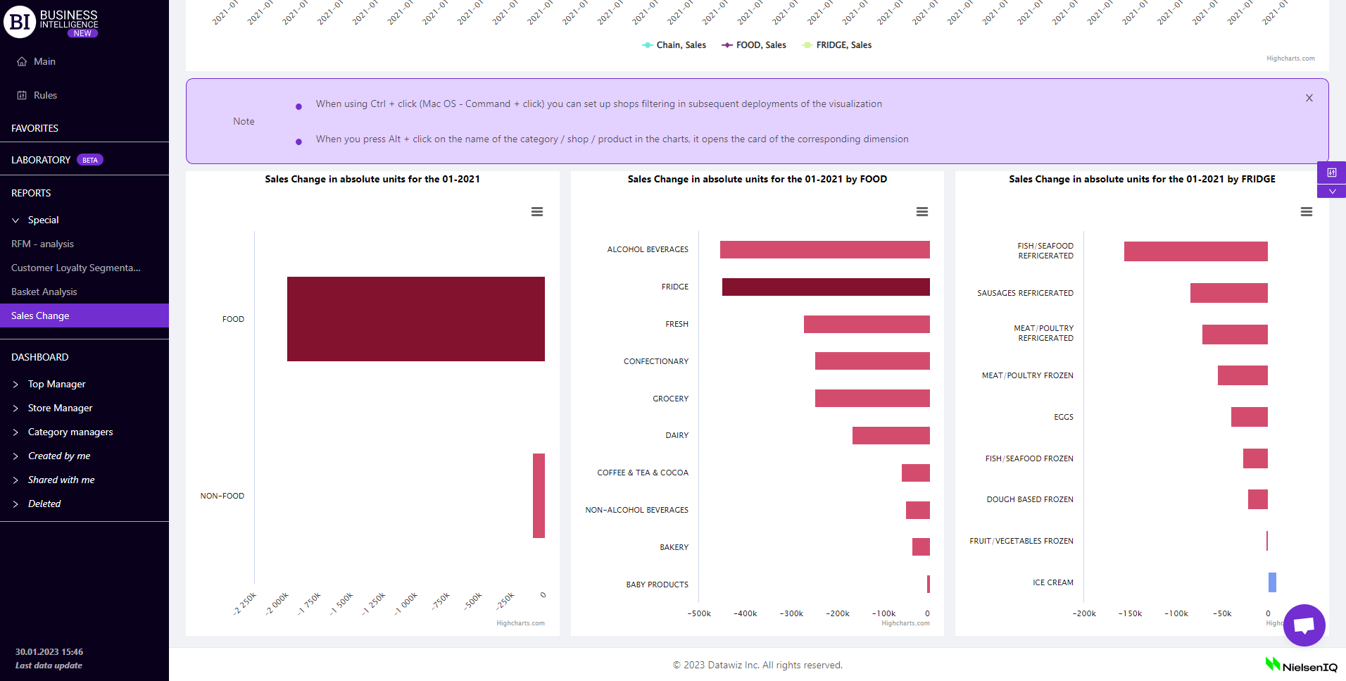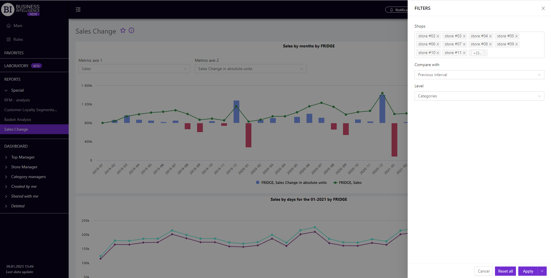 The "Sales Change" report is designed to quickly find the reasons for the decline, or increase sales metrics at all levels, from shops/categories, and down to the SKU. It contains charts showing changes in chain sales. Clicking on a visualization element forms a chart of the next lower level, and such a fall allows you to identify which categories, shops, or products caused a change in performance.