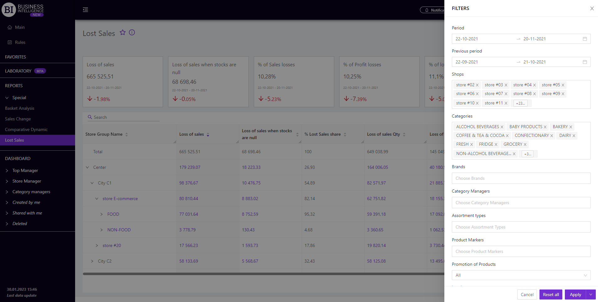 Brand salesStore cardProduct CardBasket AnalysisQuadrant analysisProducers analysisPlanogram EfficiencyLost SalesSales ChangeCategory managersSuppliers salesMarkers comparisonCategory CardProducts salesStores salesCategories salesStock MonitoringMainUnsaleable productsPrediction of OoS24-Hour AnalysisProducts movementEffectiveness of сashiersProducts for adjustmentPOS-terminal TrafficSales PlansPromotion AnalysisNew SKUEffectiveness of Loyalty ProgramPromo CardRFM - analysisStatistic of Loyalty ProgramCustomer Loyalty SegmentationLoyalty CardComparative DynamicsReceiptsLOST SALES