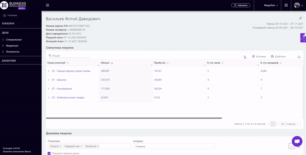 The "Loyalty Card" report summarizes the basic data by the loyalty program client and allows to analyze the dynamics of their purchases.