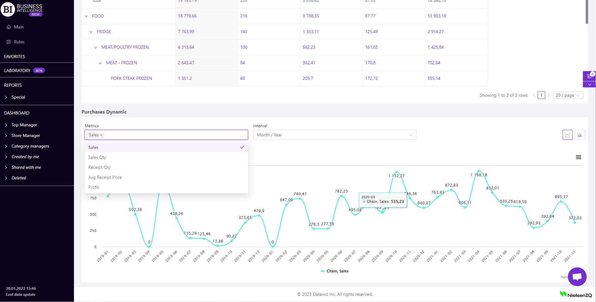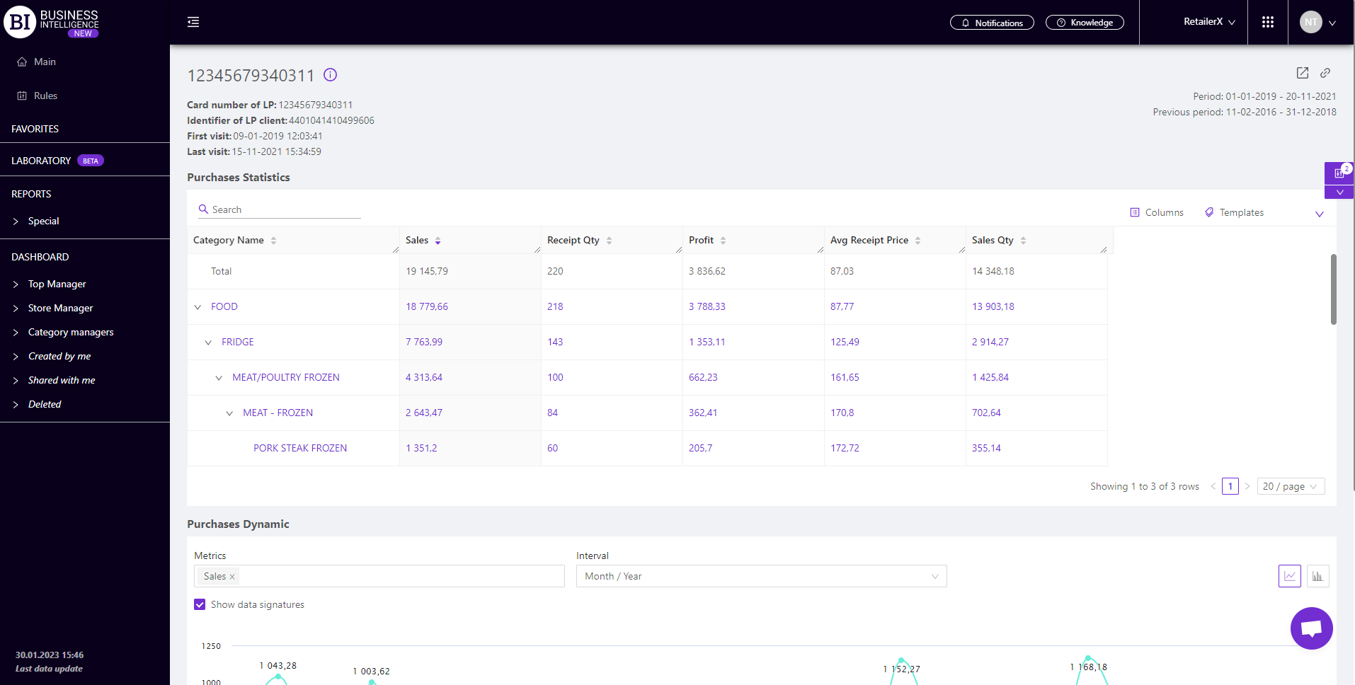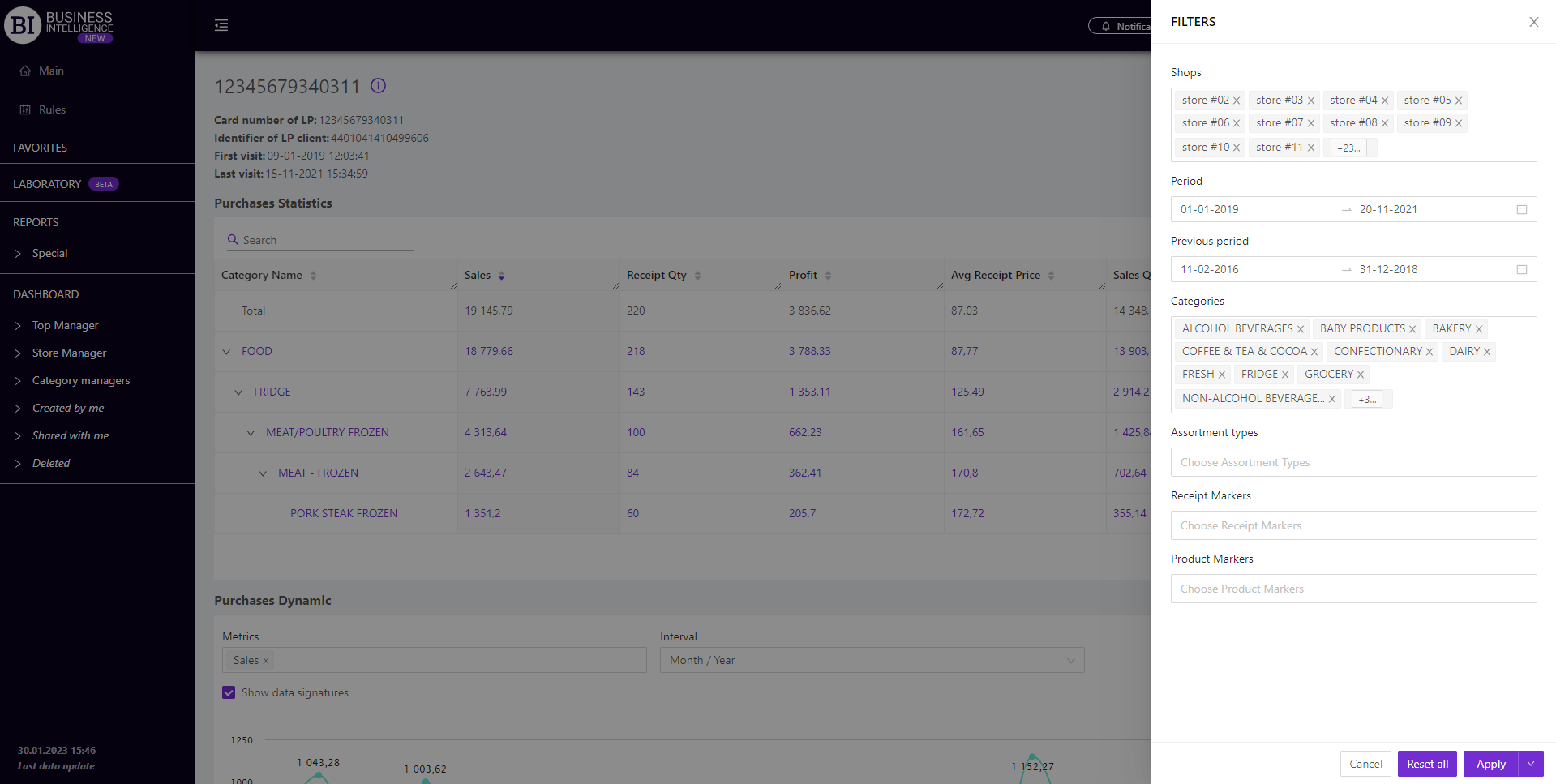 Brand salesStore cardProduct CardBasket AnalysisQuadrant analysisProducers analysisPlanogram EfficiencyLost SalesSales ChangeCategory managersSuppliers salesMarkers comparisonCategory CardProducts salesStores salesCategories salesStock MonitoringMainUnsaleable productsPrediction of OoS24-Hour AnalysisProducts movementEffectiveness of сashiersProducts for adjustmentPOS-terminal TrafficSales PlansPromotion AnalysisNew SKUEffectiveness of Loyalty ProgramPromo CardRFM - analysisStatistic of Loyalty ProgramCustomer Loyalty SegmentationLoyalty CardComparative DynamicsReceiptsLOYALTY CARD