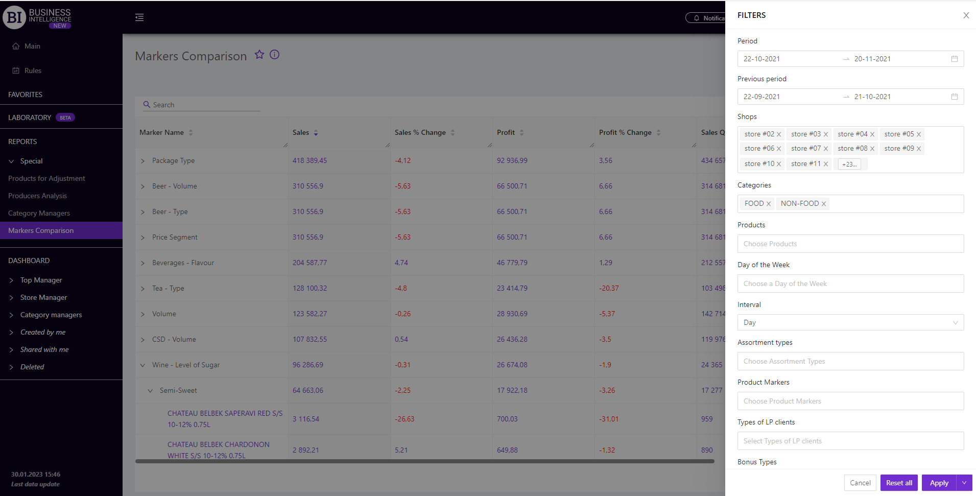 Brand salesStore cardProduct CardBasket AnalysisQuadrant analysisProducers analysisPlanogram EfficiencyLost SalesSales ChangeCategory managersSuppliers salesMarkers comparisonCategory CardProducts salesStores salesCategories salesStock MonitoringMainUnsaleable productsPrediction of OoS24-Hour AnalysisProducts movementEffectiveness of сashiersProducts for adjustmentPOS-terminal TrafficSales PlansPromotion AnalysisNew SKUEffectiveness of Loyalty ProgramPromo CardRFM - analysisStatistic of Loyalty ProgramCustomer Loyalty SegmentationLoyalty CardComparative DynamicsReceiptsMARKERS COMPARISON