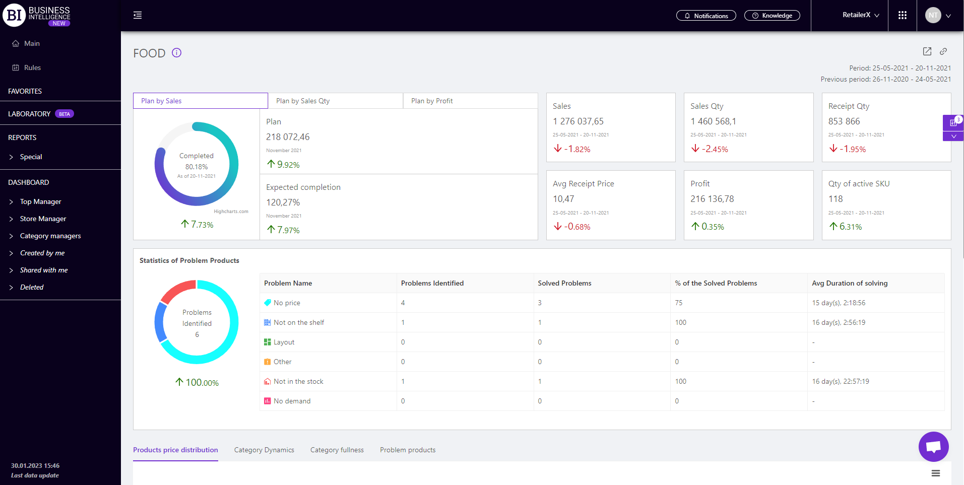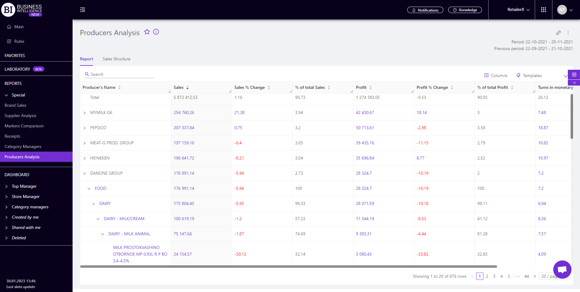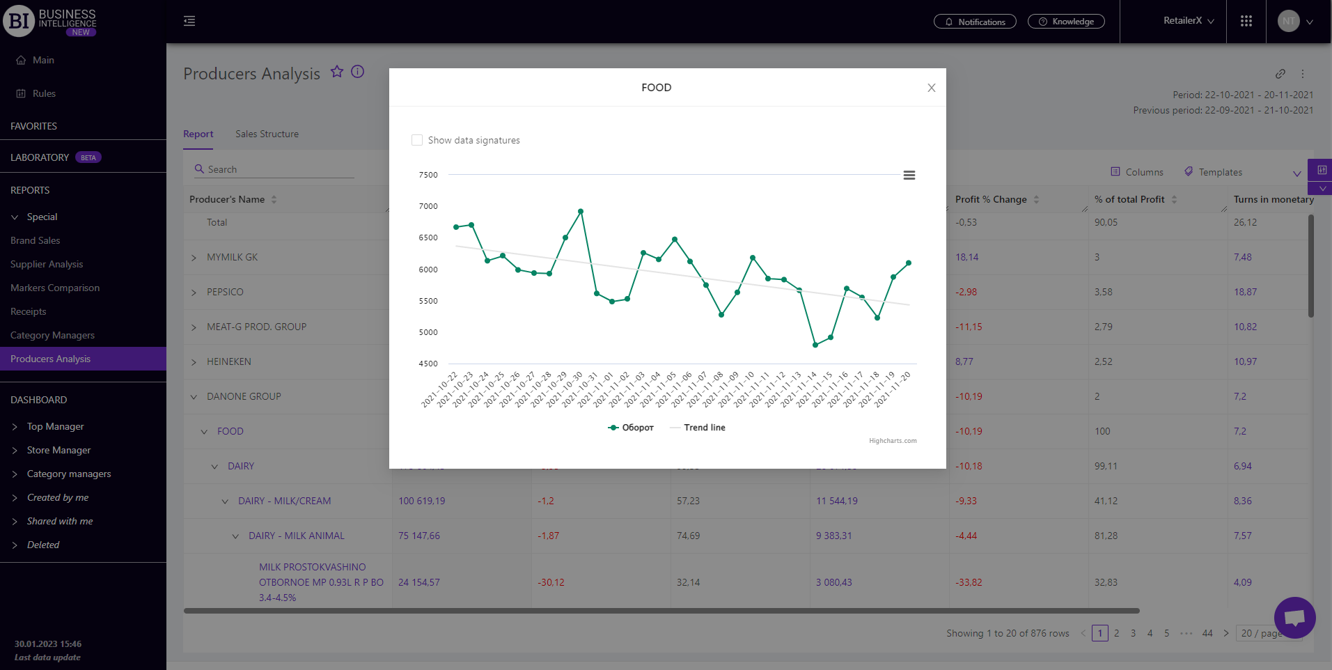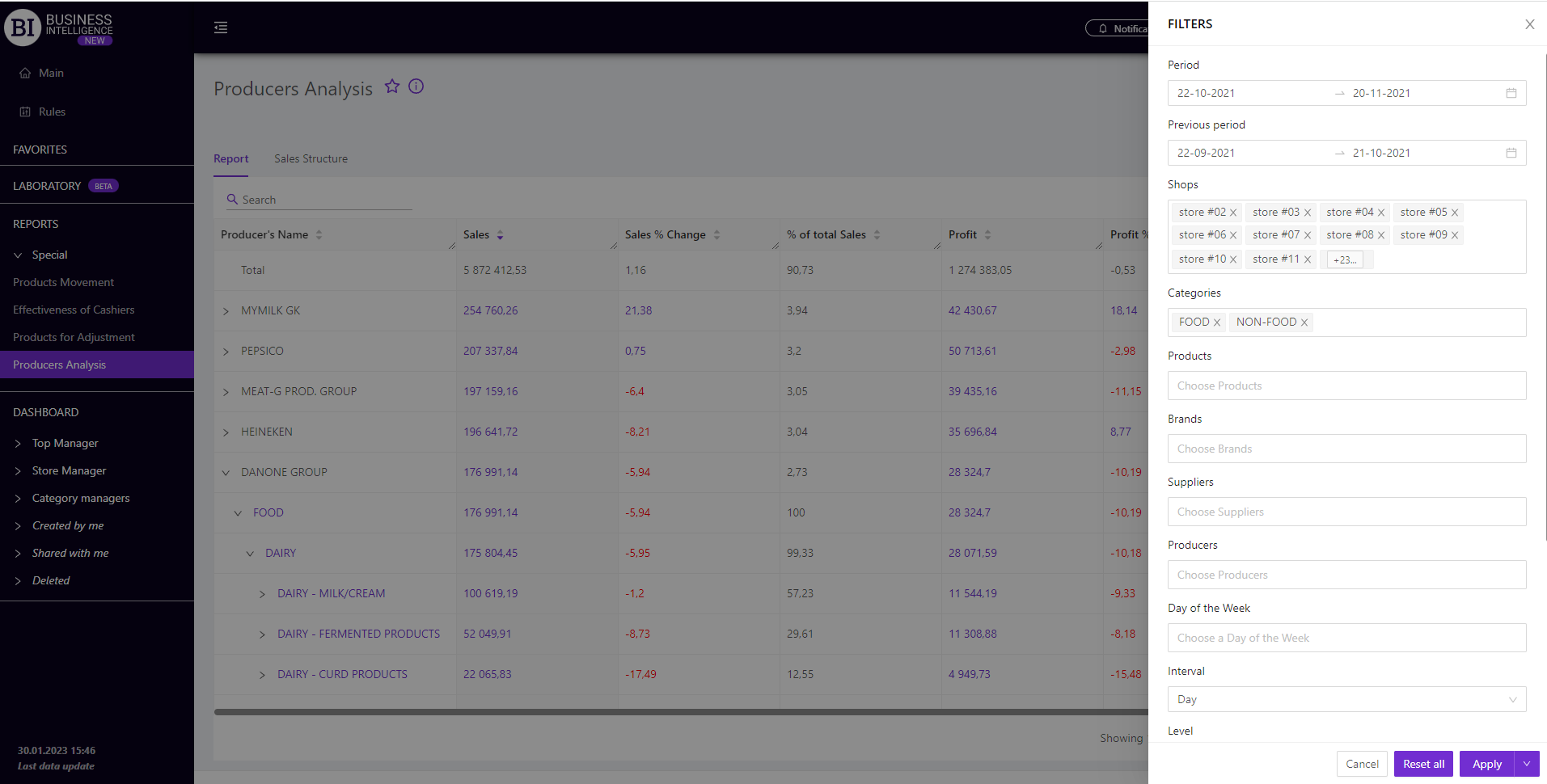 Brand salesStore cardProduct CardBasket AnalysisQuadrant analysisProducers analysisPlanogram EfficiencyLost SalesSales ChangeCategory managersSuppliers salesMarkers comparisonCategory CardProducts salesStores salesCategories salesStock MonitoringMainUnsaleable productsPrediction of OoS24-Hour AnalysisProducts movementEffectiveness of сashiersProducts for adjustmentPOS-terminal TrafficSales PlansPromotion AnalysisNew SKUEffectiveness of Loyalty ProgramPromo CardRFM - analysisStatistic of Loyalty ProgramCustomer Loyalty SegmentationLoyalty CardComparative DynamicsReceiptsPRODUCERS ANALYSIS