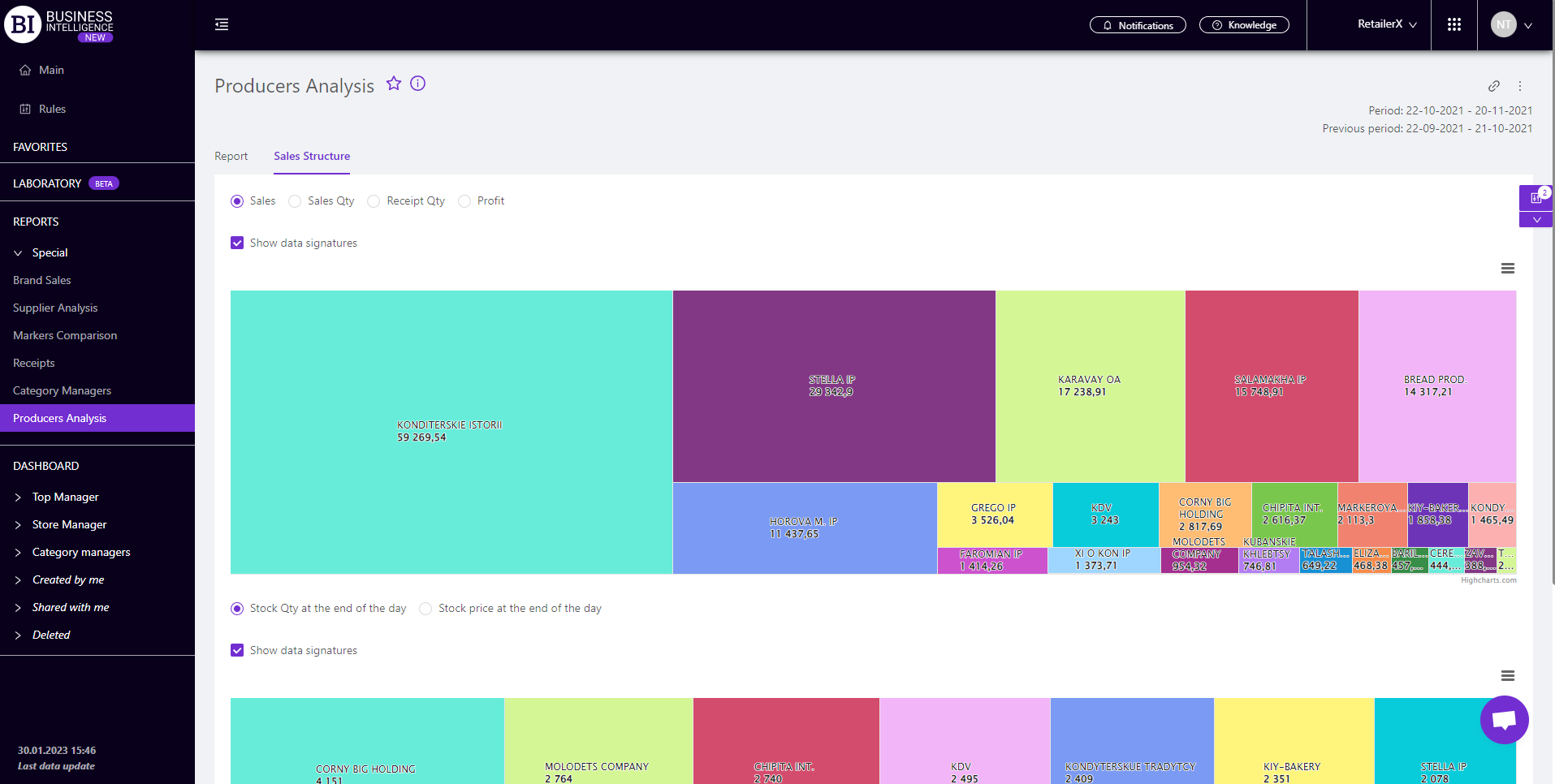 upper visualization represents the structure of sales in context of producers, and is based on one of the following metrics: Sales, Sales Qty, Receipts Qty, Profit.