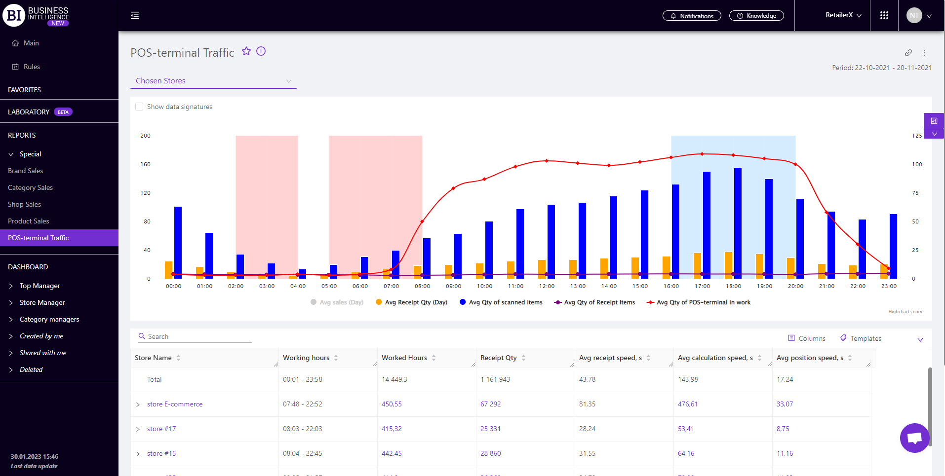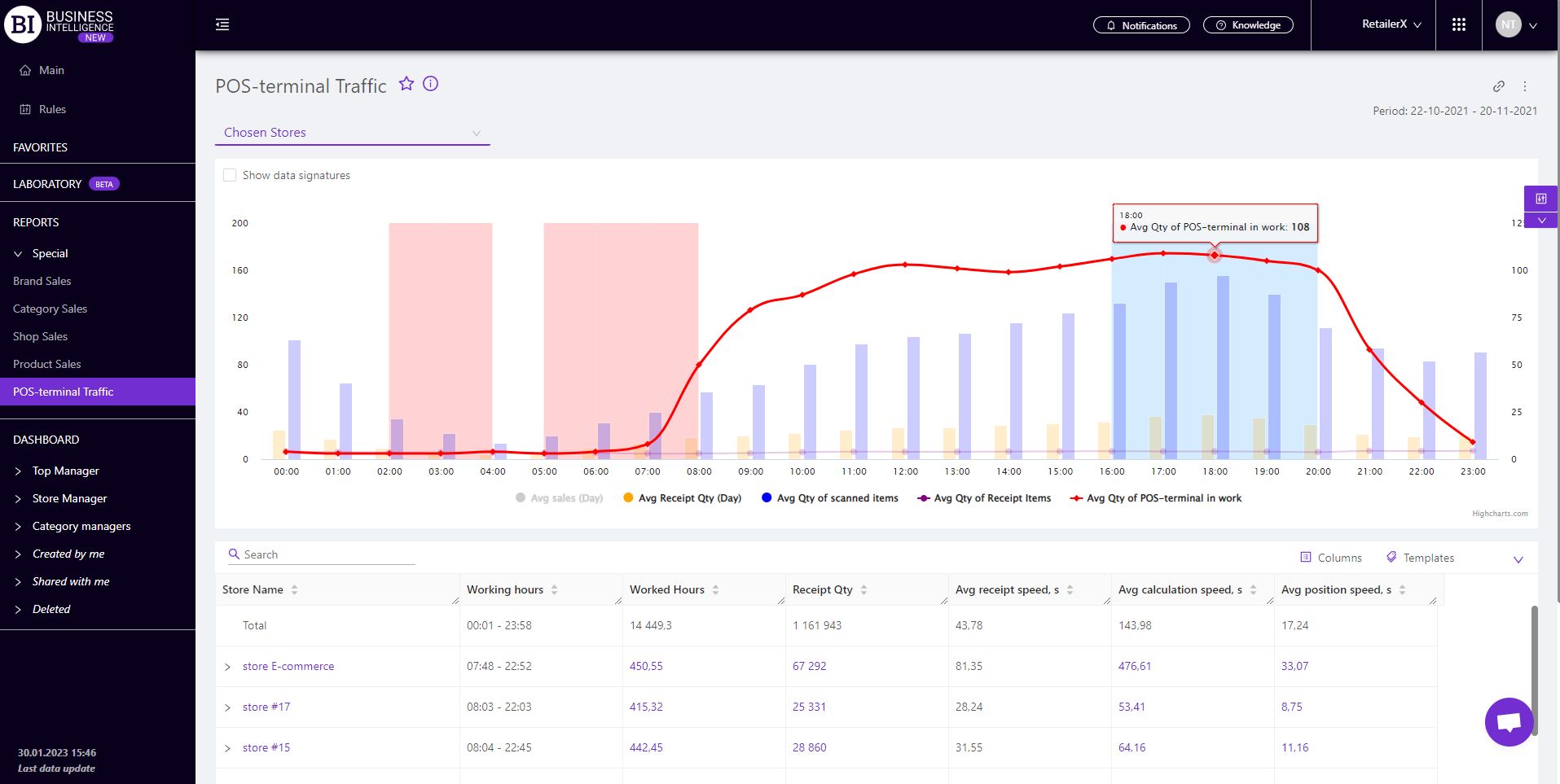 The "POS-terminal Traffic" report contains sales metrics that show the efficiency of the chain terminals. The data are presented in graphical and tabular form.