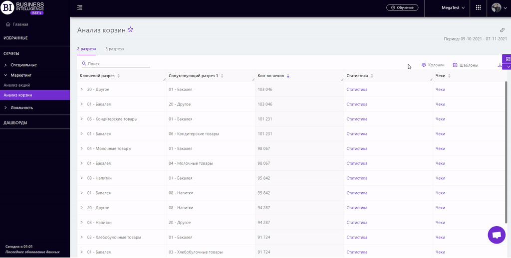 Примечание! На вкладке "2 разреза" отображаются корзины с выбранным ключевым разрезом в комбинации с еще одним разрезом, который продается с ним. Вкладка "3 разреза" показывает продажи ключевого разреза с двумя сопутствующими разрезами.
