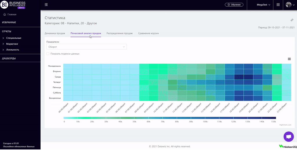 Вкладка "Почасовой анализ продаж" - визуализация, показывающая показатели продаж с выбранными разрезами (категориями, товарами) по часам и дням недели.