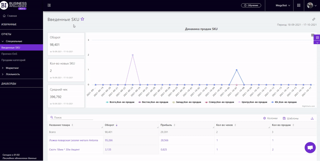 - просматривать количество продаж новых SKU на различных уровнях (регионов, областей и отдельных магазинов);