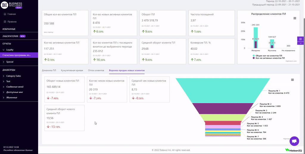 Справа находится визуализация "Воронка продаж", отображающая группы клиентов по количеству совершенных покупок.