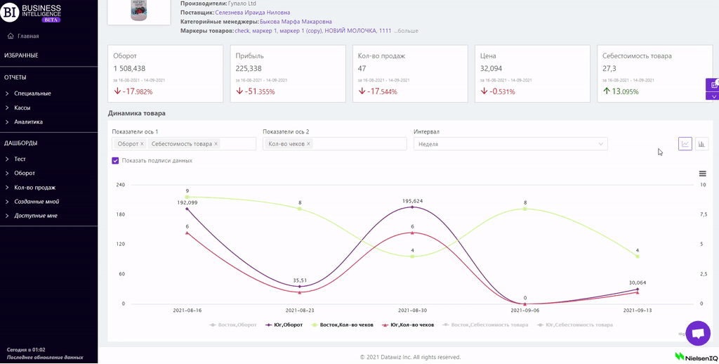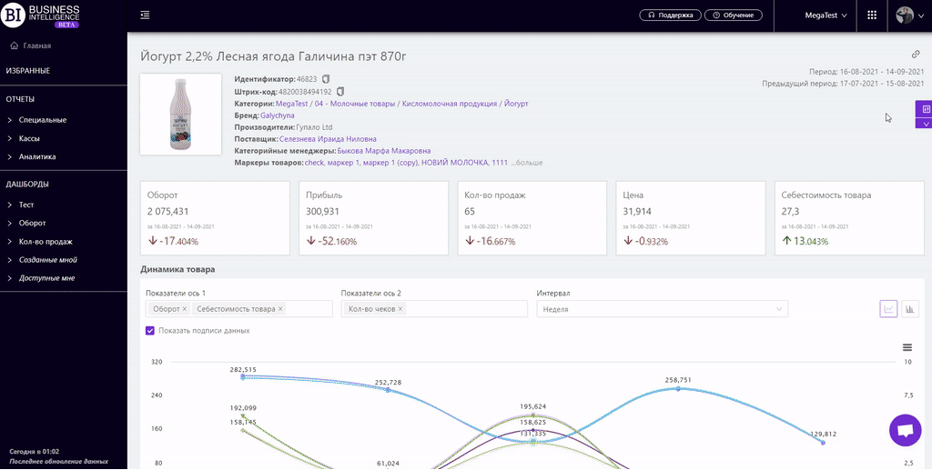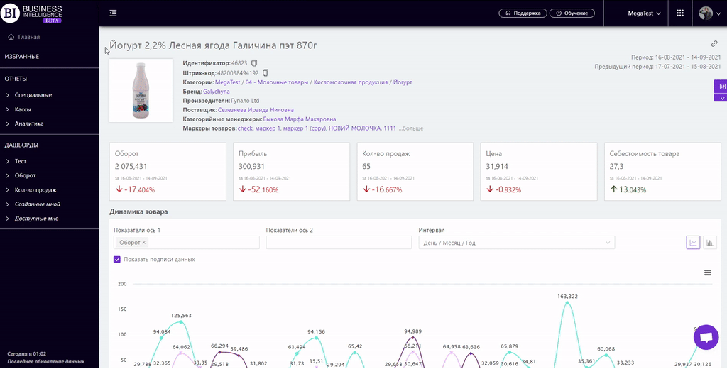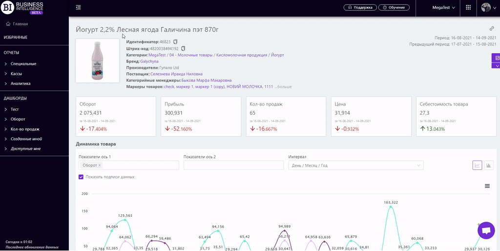 Продажи брендовКарточка магазинаКарточка товараАнализ корзинКвадрантный анализАнализ производителейЭффективность планограммУпущенные продажиИзменения продажКатегорийные менеджерыАнализ поставщиковСравнение маркеровКарточка категорииПродажи товаровПродажи магазиновПродажи категорийКонтроль остатковГлавнаяТовары на выводПрогноз OoSПочасовой анализДвижение товаровЭффективность кассировТовары для переучетаПроходимость кассПланы продажАнализ акцийВведенные SKUЭффективность программы лояльностиКарточка акцииRFM - анализСтатистика программы лояльностиСегменты клиентов программы лояльностиКарточка клиента ПЛСравнительная динамикаЧекиКАРТОЧКА ТОВАРА
