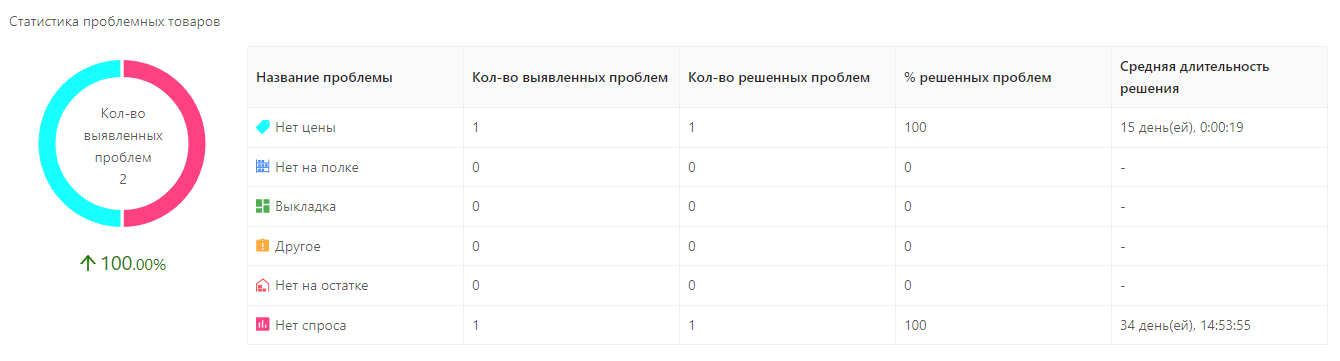Блок “Статистика проблемных товаров” показывает информацию по всем проблемам, выявленным по товару, статистику их возникновения и решения.