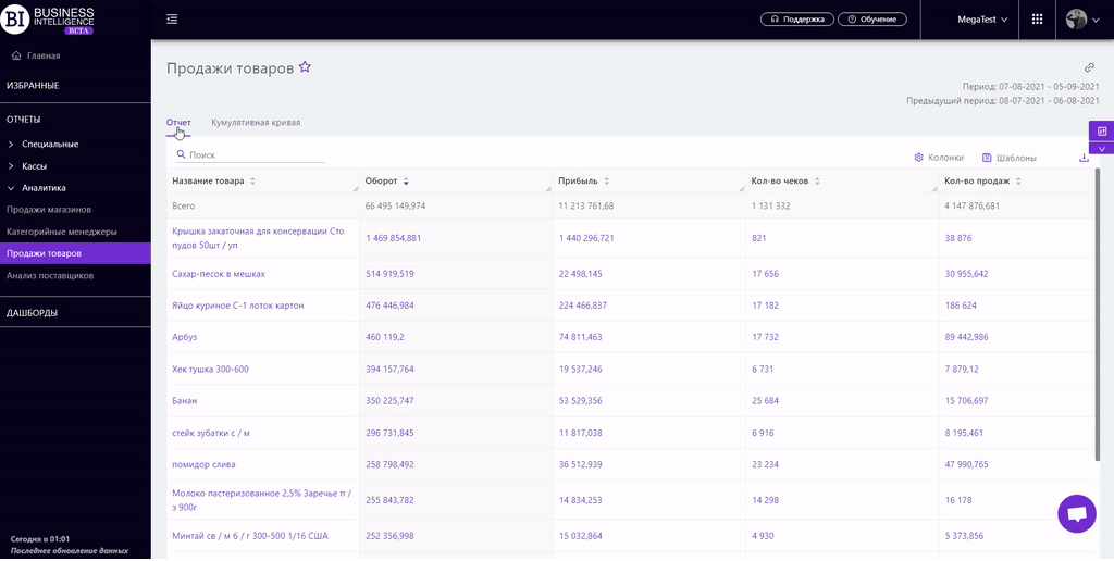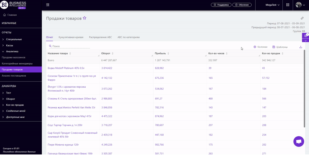Продажи брендовКарточка магазинаКарточка товараАнализ корзинКвадрантный анализАнализ производителейЭффективность планограммУпущенные продажиИзменения продажКатегорийные менеджерыАнализ поставщиковСравнение маркеровКарточка категорииПродажи товаровПродажи магазиновПродажи категорийКонтроль остатковГлавнаяТовары на выводПрогноз OoSПочасовой анализДвижение товаровЭффективность кассировТовары для переучетаПроходимость кассПланы продажАнализ акцийВведенные SKUЭффективность программы лояльностиКарточка акцииRFM - анализСтатистика программы лояльностиСегменты клиентов программы лояльностиКарточка клиента ПЛСравнительная динамикаЧекиПРОДАЖИ ТОВАРОВ