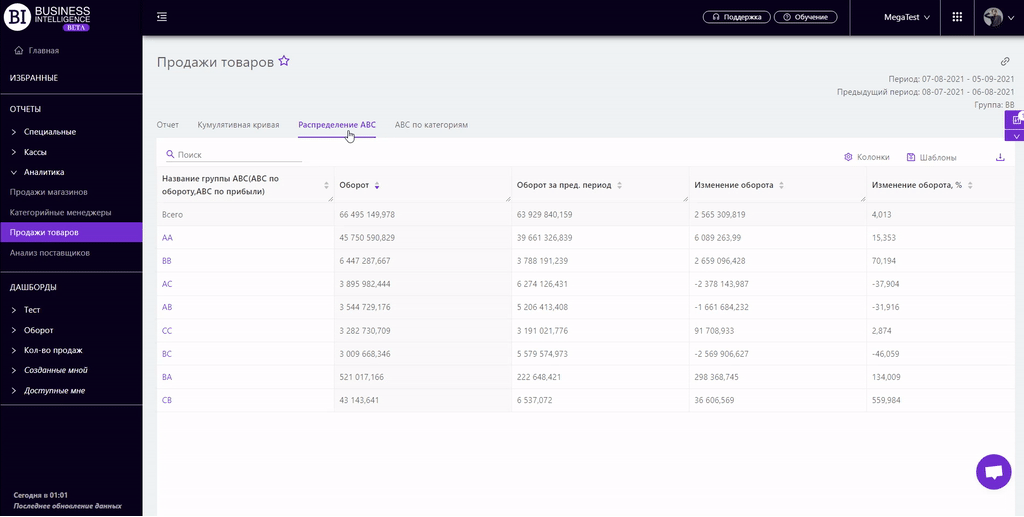 Группы АВС-анализа образуются в разрезе показателей: Оборот, Кол-во продаж, Кол-во чеков, Прибыль.