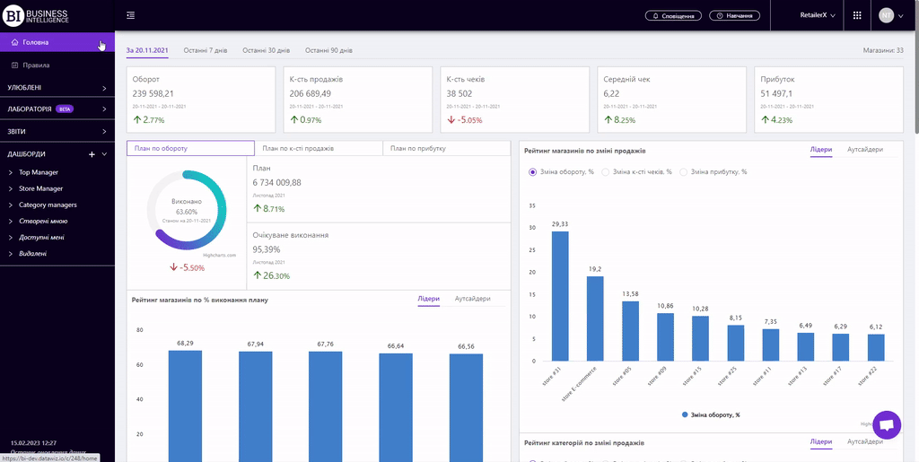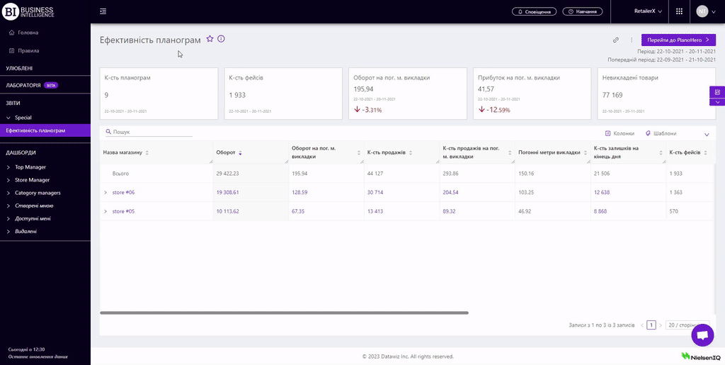 Продажі брендівКартка магазинуКартка товаруАналіз корзинКвадрантний аналізАналіз виробниківЕфективність планограмВтрачені продажіЗміни продажівКатегорійні менеджериАналіз постачальниківПорівняння маркерівКартка категоріїПродажі товарівПродажі магазинівПродажі категорійКонтроль залишківГоловнаТовари на виведенняПрогноз OoSПогодинний аналізРух товарівЕфективність касирівТовари для переоблікуПрохідність касПлани продажівАналіз акційВведені SKUЕфективність програми лояльностіКартка акціїRFM - аналізСтатистика програми лояльностіСегменти клієнтів ПЛКартка клієнта ПЛПорівняльна динамікаЧекиЕФЕКТИВНІСТЬ ПЛАНОГРАМ