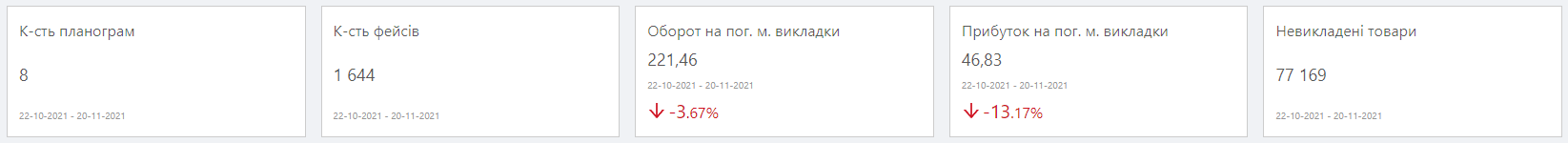 Вгорі розміщені інформаційні картки з показниками, які відображають основну інформацію по планограмах за вибраний період, а саме: