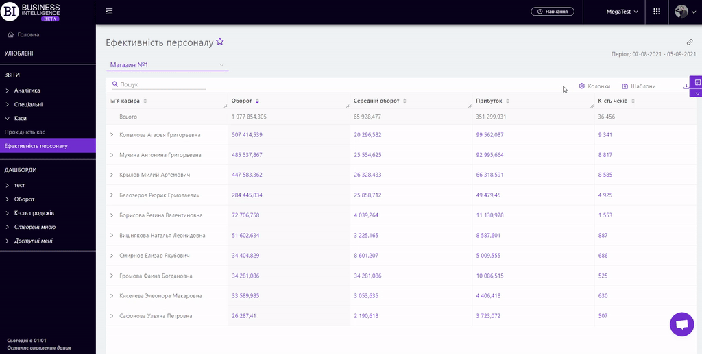 Звіт "Ефективність касирів" містить основну інформацію по касирах мережі, що дозволяє оцінювати результативність їх роботи, виявляючи найбільш та найменш продуктивних працівників.